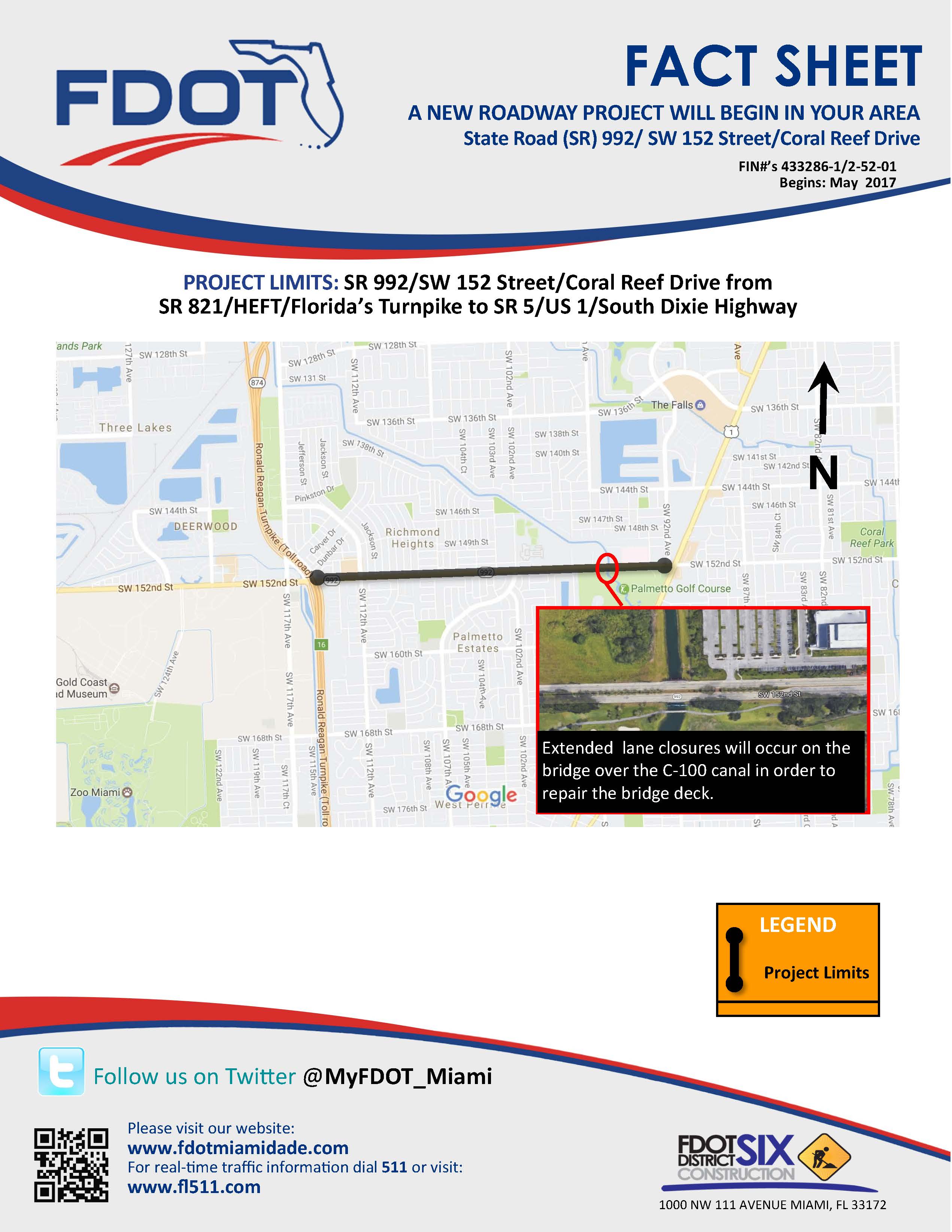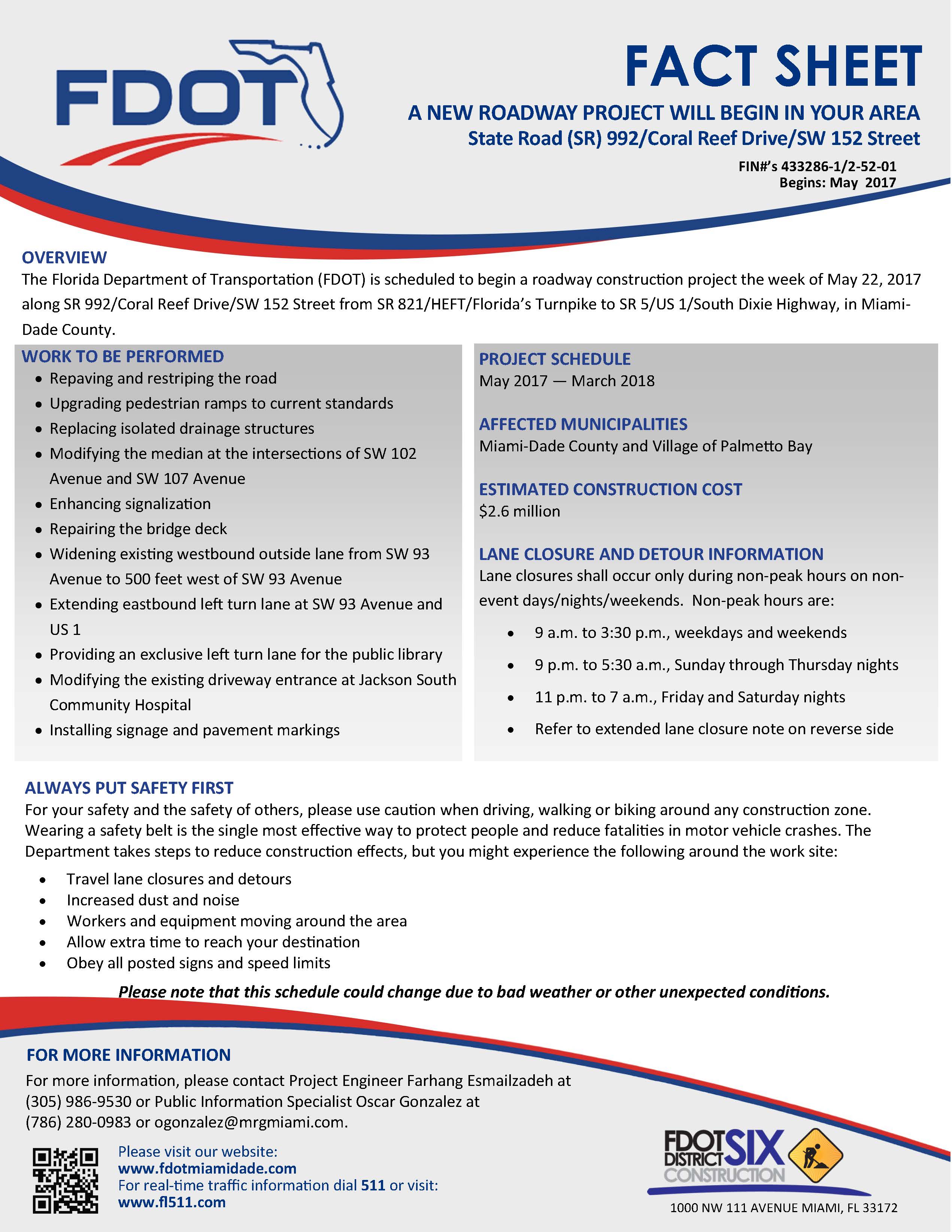 FDOT began a roadway construction project the week of May 22, 2017 along State Road (SR) 992/SW 152 Street/Coral Reef Drive from SR 821/HEFT/Florida’s Turnpike to SR 5/US 1/South Dixie Highway. Daytime lane closures can be expected from 9 a.m. to 3:30 p.m. Entrances to properties will be kept open and detours will be used while the contractor performs work at intersections and side streets.